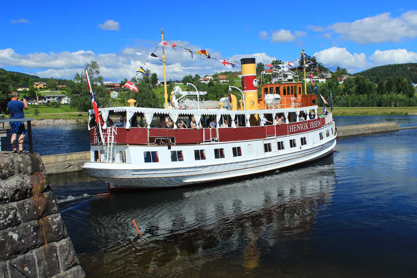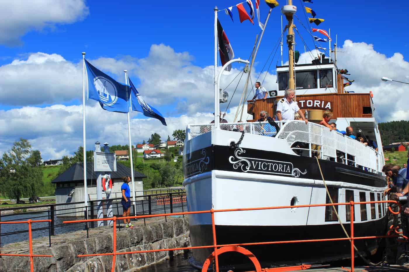 Heldigvis plass til oss denne gangen også, så vi slo oss til her for to netter. Denne gangen fikk vi med oss kanalbåtene som møtes ved slusa hver dag ved 13 tiden. Siden vi en gang for mange år siden tok en av Kanalbåtene fra Ulefoss så var ikke dette noe mål, men flott å se båtene fullpakket med mennesker i julisola.
